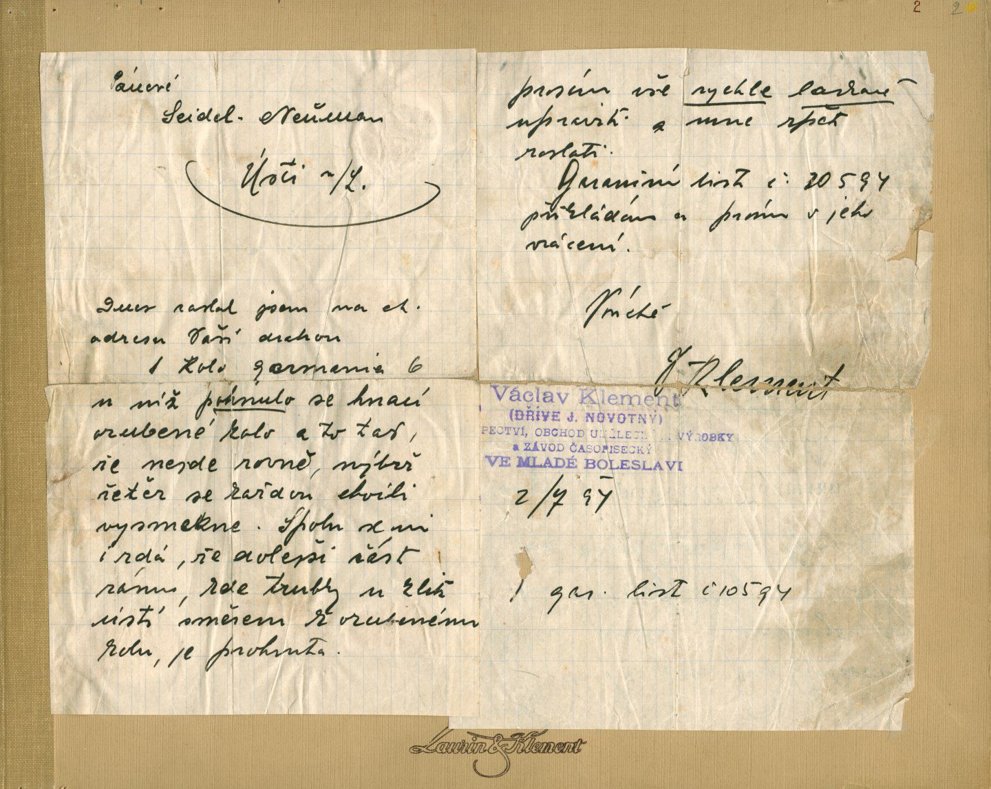 Đó là năm 1894. Năm sẽ là một bước ngoặt cơ bản trong cuộc đời của Václav Klement, 26 tuổi, sinh ra ở thị trấn Velvary và hiện đang bán sách và bản nhạc ở Mladá Boleslav. Vào thứ Bảy ngày 2 tháng 6, anh kết hôn với Antonia Jakšová. Của hồi môn của cô sẽ trả hết số nợ còn lại cho hiệu sách của anh, nơi cũng là nơi gặp gỡ của những người đam mê đạp xe. Bản thân Václav Klement đã lái chiếc xe đạp Germania do hãng Seidel & Naumann của Đức sản xuất, có chi nhánh tại thành phố Ústí nad Labem. Vào tháng 7 năm 1894, người bán sách đóng gói chiếc xe đạp liên tục bị lỏng xích của mình và gửi nó bằng tàu hỏa đến Ústí nad Labem để sửa chữa bảo hành. Nhưng chi nhánh không có ý định giải quyết yêu cầu có phần không chính thức của khách hàng được viết tay trên một mảnh giấy kẻ ô vuông thông thường. Mặc dù câu trả lời từ giám đốc chi nhánh, ông Foerster, khiến Klement tức giận, nhưng nó cũng cho ông ý tưởng chuyển sang sản xuất xe đạp bằng chính đôi tay của mình. Anh ấy đã cùng với thợ cơ khí Václav Laurin có trụ sở tại Turnov và năm sau, họ bắt đầu sản xuất những chiếc xe đạp thành công với cái tên yêu nước Slavia, bắt nguồn từ một nữ thần Slavonic. Năm 1899, họ bắt đầu sản xuất mô tô và sáu năm sau là chiếc ô tô LAURIN & KLEMENT cũng có kết quả thành công không kém – và phần còn lại là lịch sử. Václav Klement sẽ sớm có được cảm giác hài lòng khi vào năm 1904, ông nhận được một lá thư có chữ ký của Mr Foerster từ Seidel & Naumann, yêu cầu giấy phép sản xuất xe máy Slavia dưới nhãn hiệu Germania. Klement, khi đó là giám đốc công ty, đã đồng ý một cách hào hiệp.