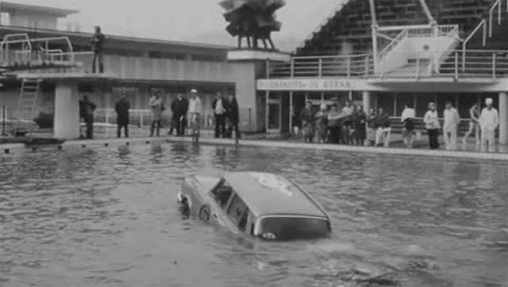 Nhân viên tạp chí đã mượn một chiếc ô tô có đồng hồ đi được 36.705 km và trang bị dây an toàn và tựa đầu cho hàng ghế trước. Hai người đàn ông liều mình nhảy xuống làn nước có nhiệt độ 5°C là nhà báo Vojtěch Měšťan và nhiếp ảnh gia Otakar Šaffek. Một chiếc xe cứu thương túc trực bên cạnh bể bơi, cùng với một chiếc cần cẩu quân đội để kéo chiếc xe ra ngoài và một số thợ lặn. Khi chiếc xe vẫn còn ở trên không và phần đầu xe sắp chạm mặt nước, tài xế đã tắt máy. Ngay khi chiếc xe bắt đầu chìm xuống, Měšťan lăn xuống cửa sổ và trèo ra ngoài. Nhiếp ảnh gia, một thợ lặn nghiệp dư có kinh nghiệm, đợi chiếc xe dừng lại dưới đáy vực. Nhưng anh không tính đến việc chiếc xe bị lật: với động cơ đặt phía sau, phần sau của chiếc xe chìm xuống nhanh hơn và không khí từ bên trong xe thoát ra ngoài qua cửa sổ hình tam giác phía trước. Nhưng Šaffek đã tự giải thoát mà không cần sự giúp đỡ. Khi chiếc xe được kéo lên khỏi mặt nước, lưới tản nhiệt của nó bị biến dạng do va chạm với nước và mui xe bị móp do áp lực nước. Josef Heřmanský, người đứng đầu công ty dịch vụ Skoda ở Praha, chỉ mất 46 phút để chiếc xe hoạt động trở lại: ông thay dầu động cơ và bugi, đồng thời làm sạch bộ chế hòa khí, bộ phân phối và bộ lọc. Chưa đầy một tiếng rưỡi trôi qua kể từ lần thử nghiệm đầu tiên, chiếc xe đã được đưa vào thử nghiệm lần hai. Lần này hai thành viên phi hành đoàn ra khỏi xe rất nhanh thông qua cửa xe.